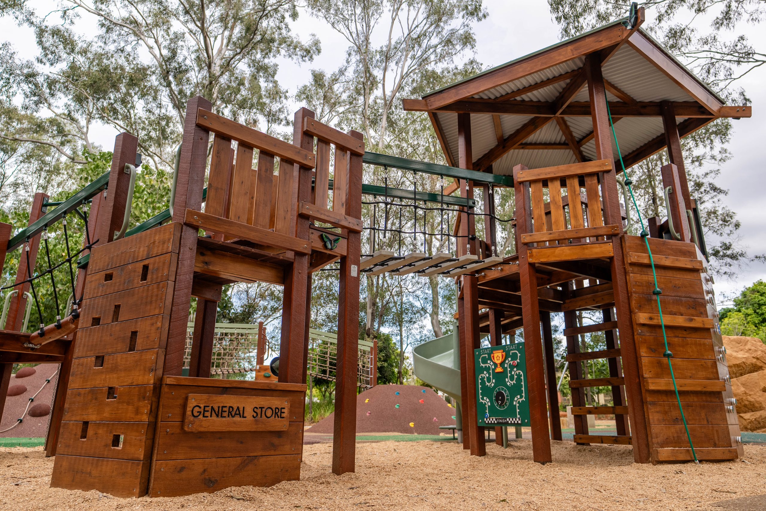 - New furniture/play equipment including custom play structure, swing, slide, and custom trail art elements